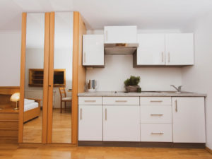 Unsere Ferienwohnung "Himmlatzn" mit Balkon bietet Platz für zwei Personen.Die Küche ist vollausgestattet & bietet neben einem Wasserkocher, einem Kühlschrank, einer (Filter-)Kaffeemaschine, sowie einen Herd mit Backofen.